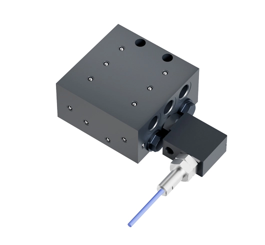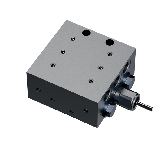 Visual or electronic monitoring can be achieved simply by removing a plug and installing a visual or electronic add-on device as shown below. The spools in a progressive metering valve operate sequentially partitioning equally across the outlets, the grease being pumped into the metering block inlet.